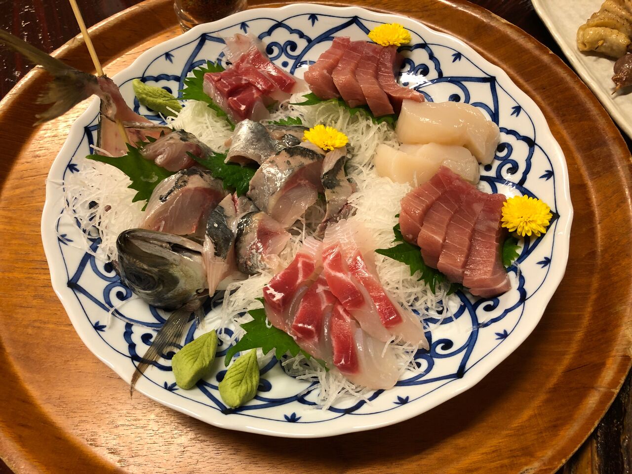 品数が多い肴から、これまたいつも通り、刺身盛り合わせです。美しく、見るから美味しいですね。