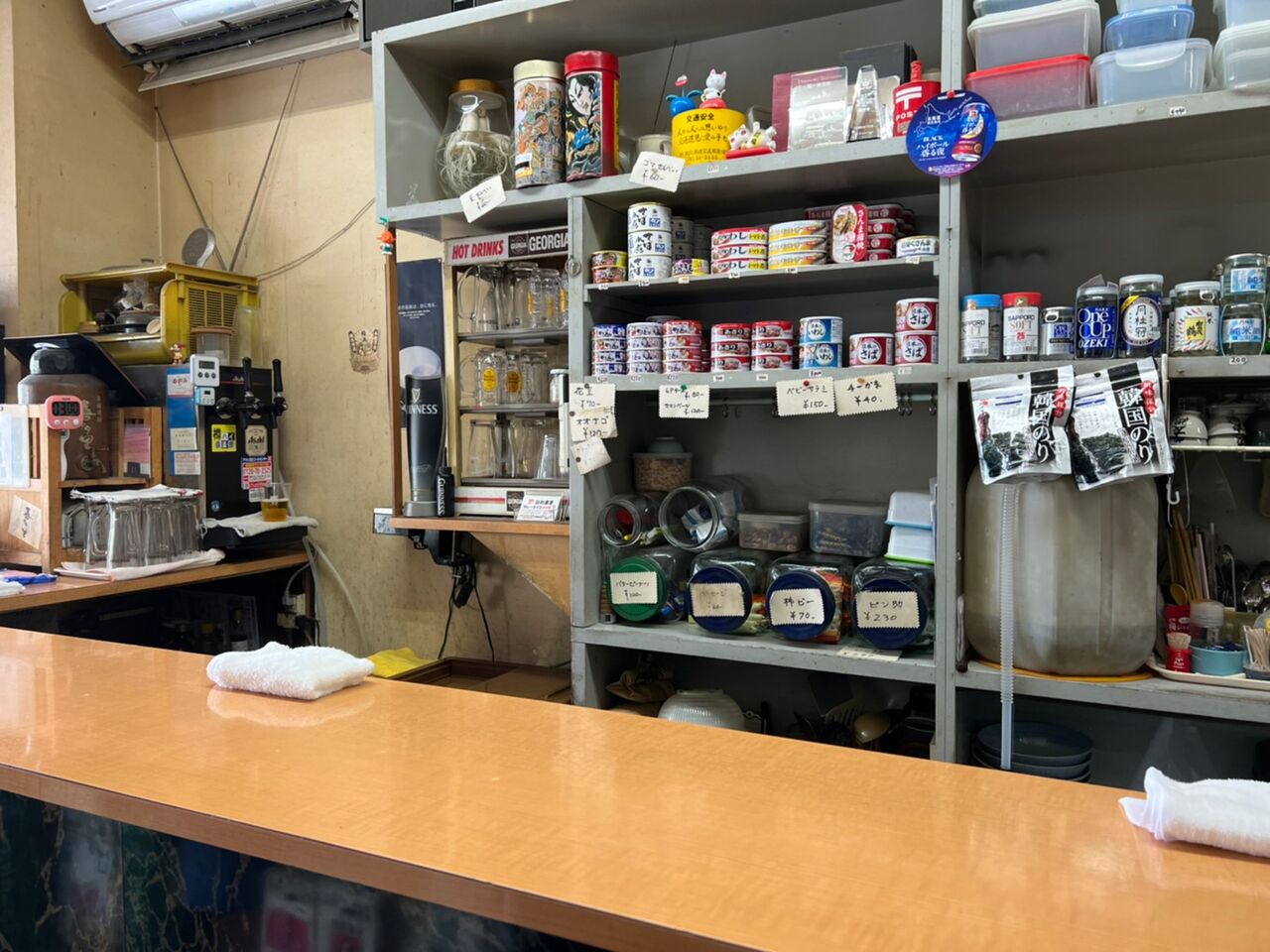 長いL字のカウンター、奥に見えるは魚の缶詰や柿ピーなどまさしく角打ち。