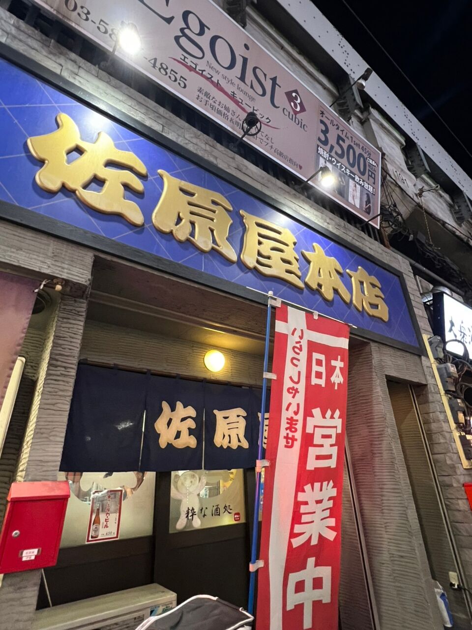 なんと味の笛の隣には、佐原屋という人気のあった老舗酒場があり、まだ営業中の旗が出ていたので入ってみます。