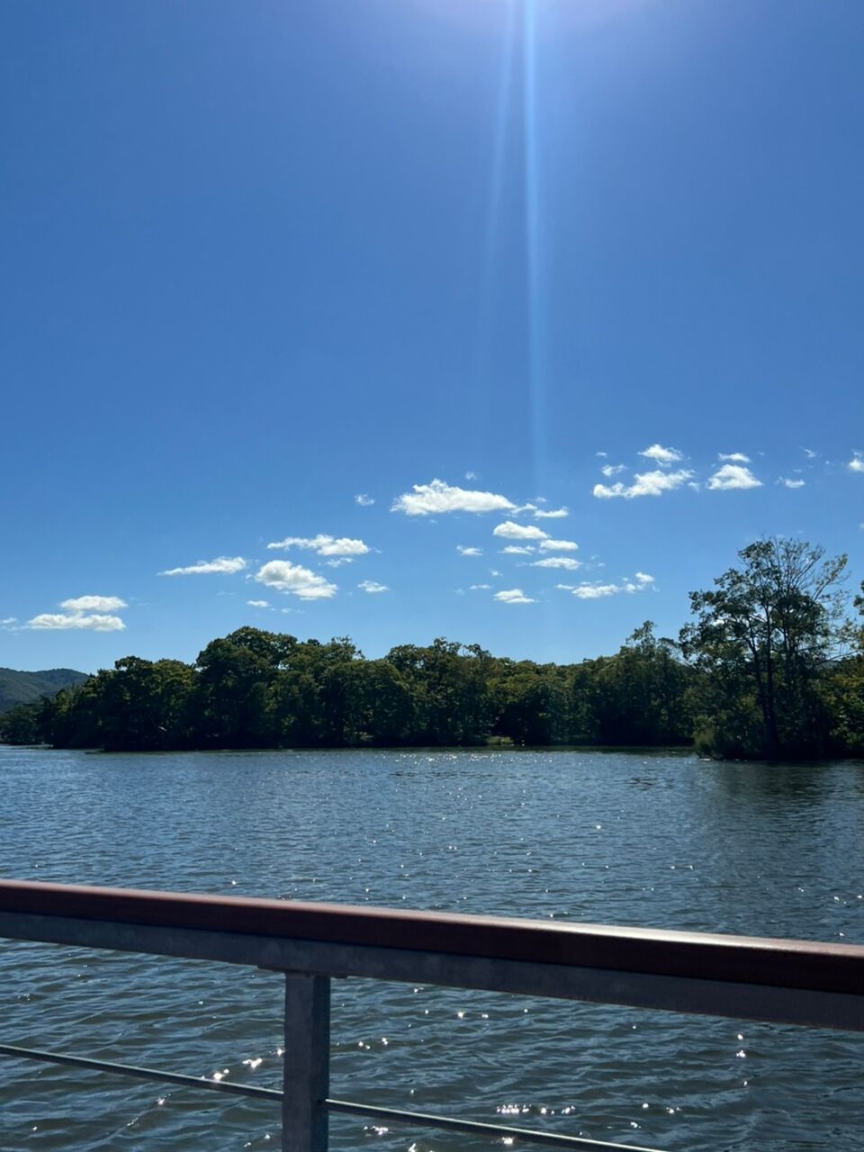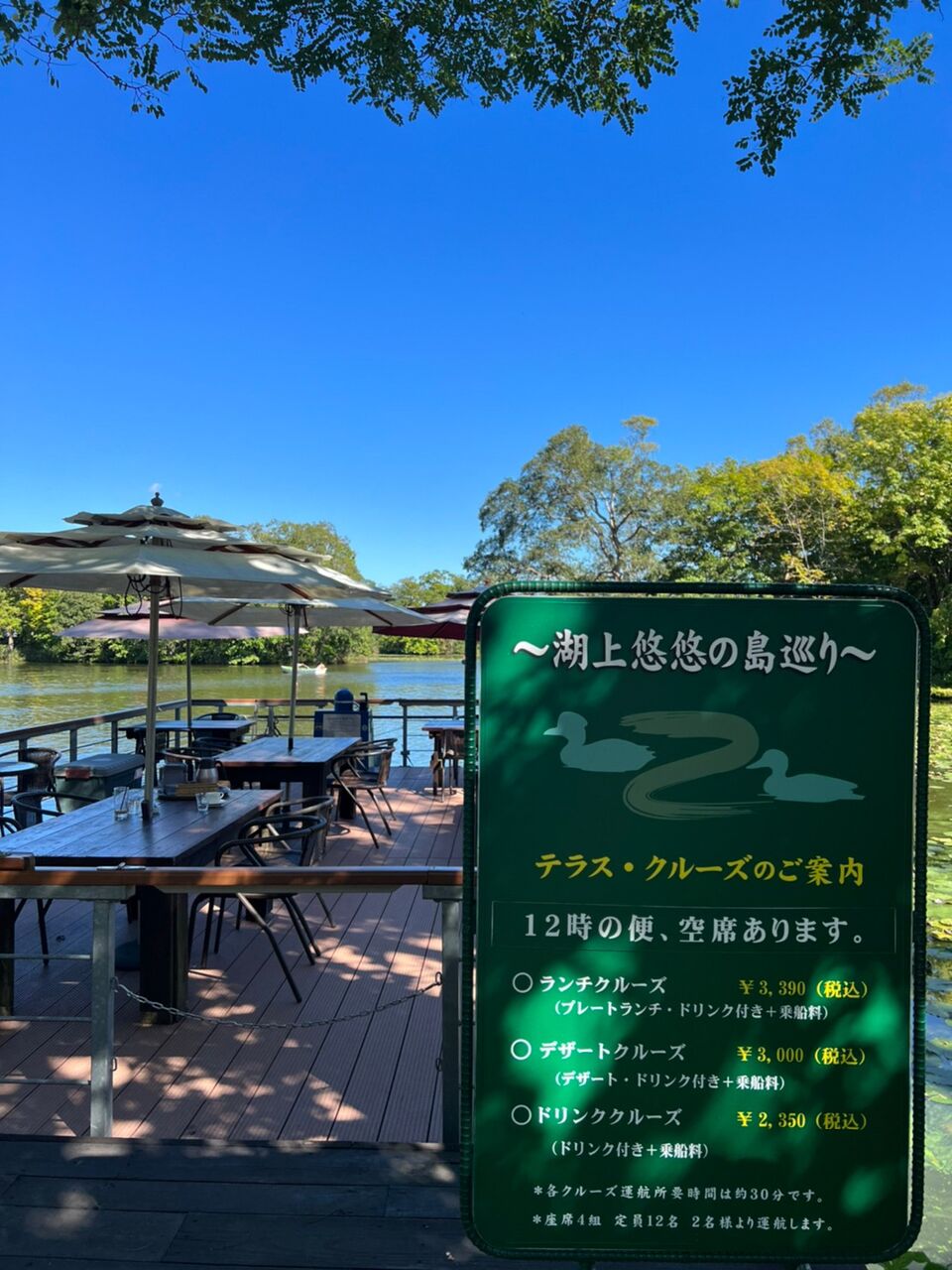 長方形のクルーズでランチやドリンクを頂きながら、大沼の景色を堪能します。