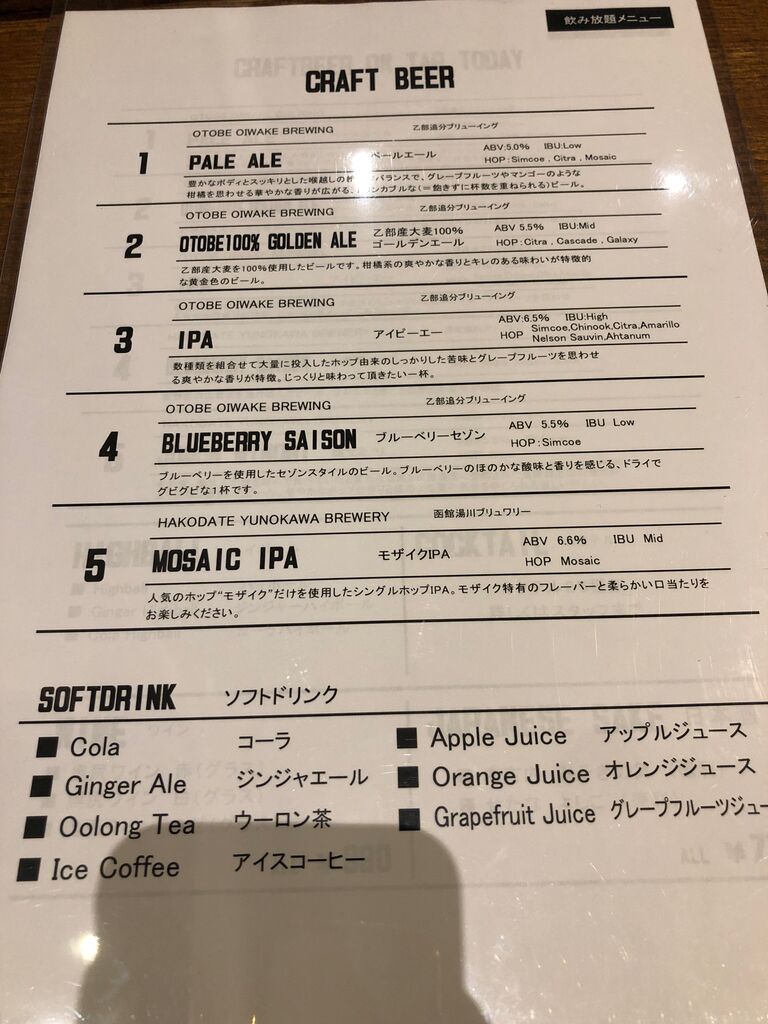 飲み放題は5種類のクラフトビール。