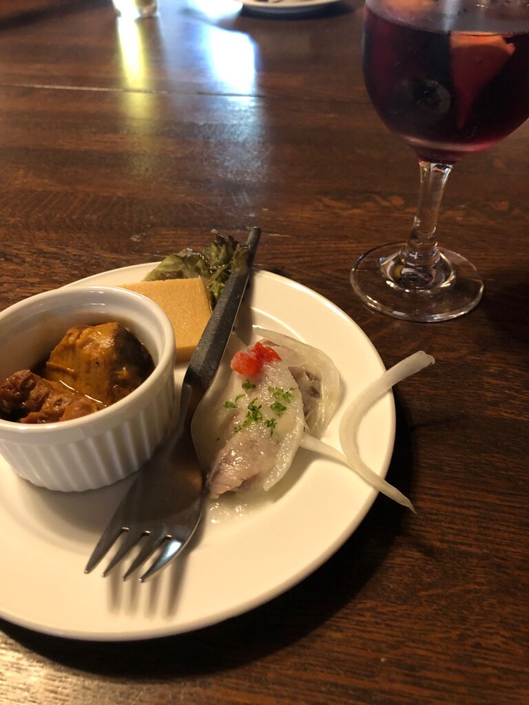 サングリアの肴は、帯広産どろ豚シチュー、ブリの酢漬け、蟹味噌でして食べ応えがあります。