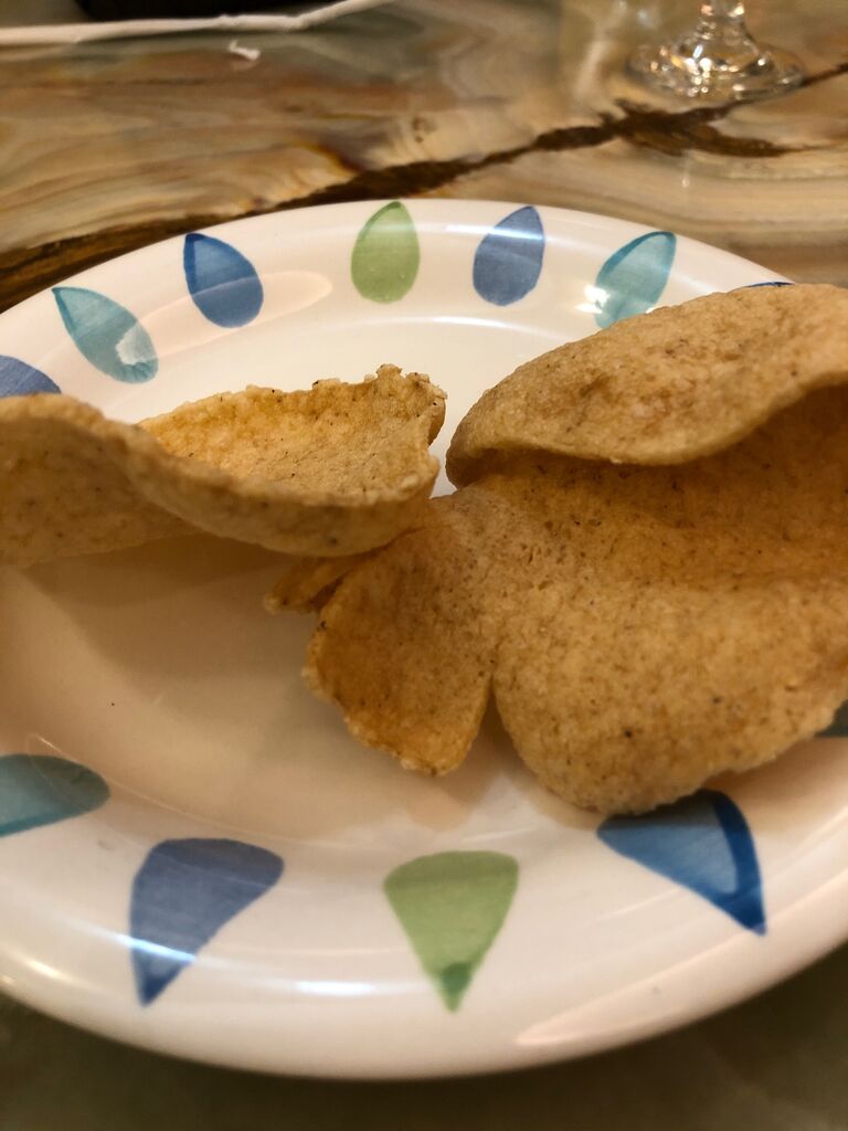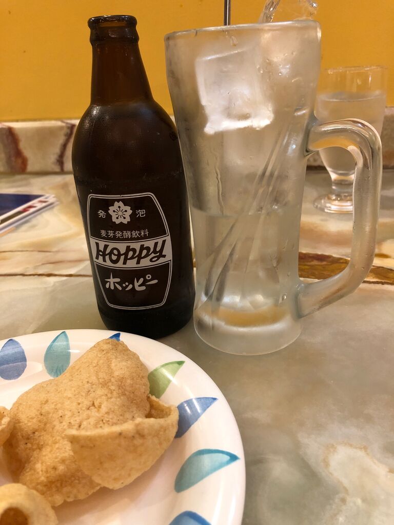 私は白ホッピーセットにお通しの海老煎餅みたいのを食べながら待ちます。