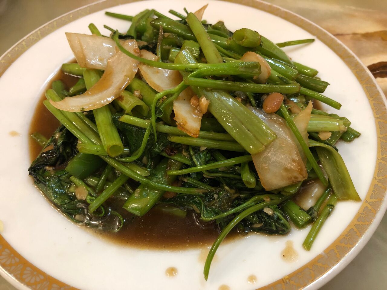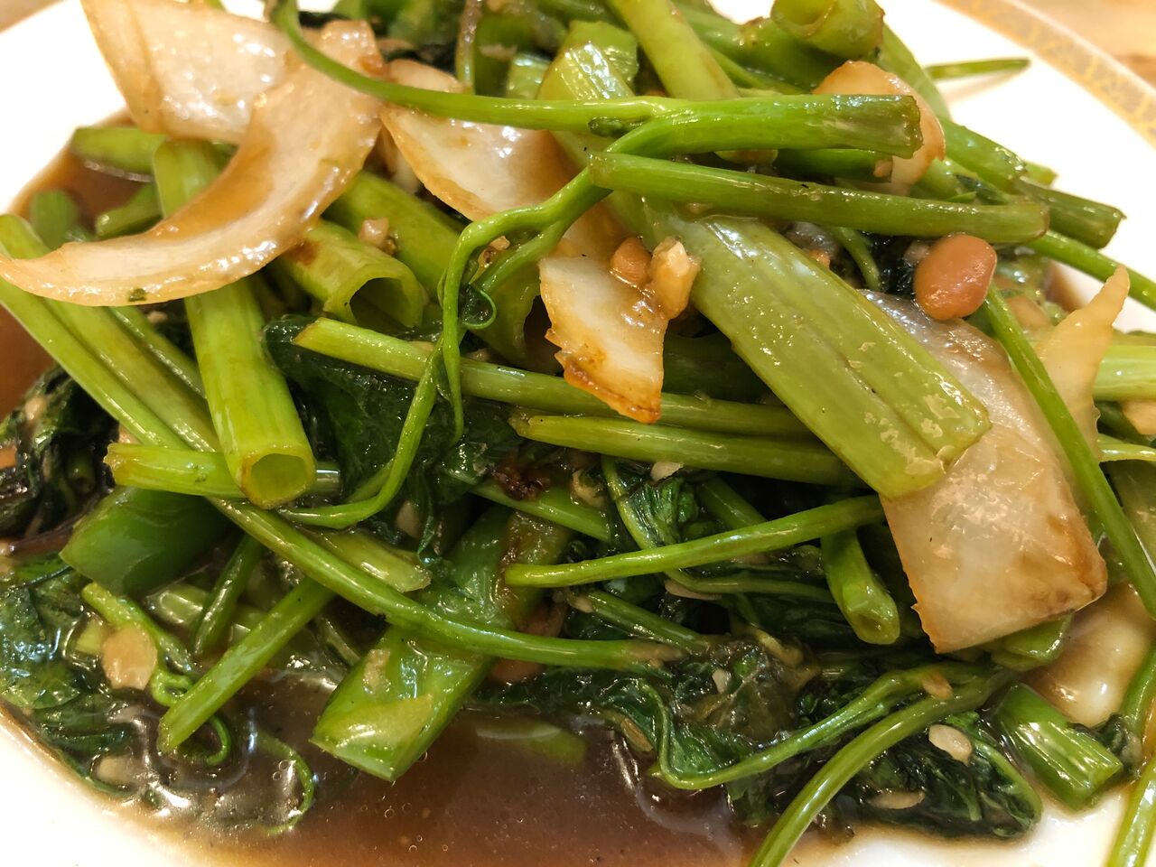 ホッピー中は3度お代わりして、来たのはパップンファイディーンというらしい空芯菜のにんにく炒め。