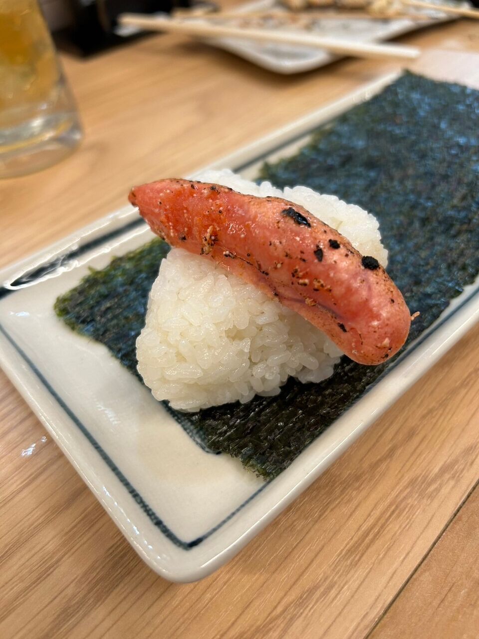 芋焼酎ロックを頼んで、お待ちかねの締めは明太子の海苔おにぎり。