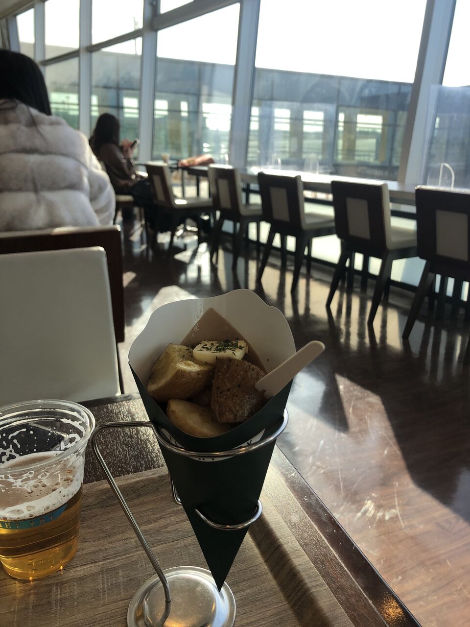 というわけでいつも通り保安検査所を通り抜け、フライトフライでサッポロクラシック生にて乾杯。