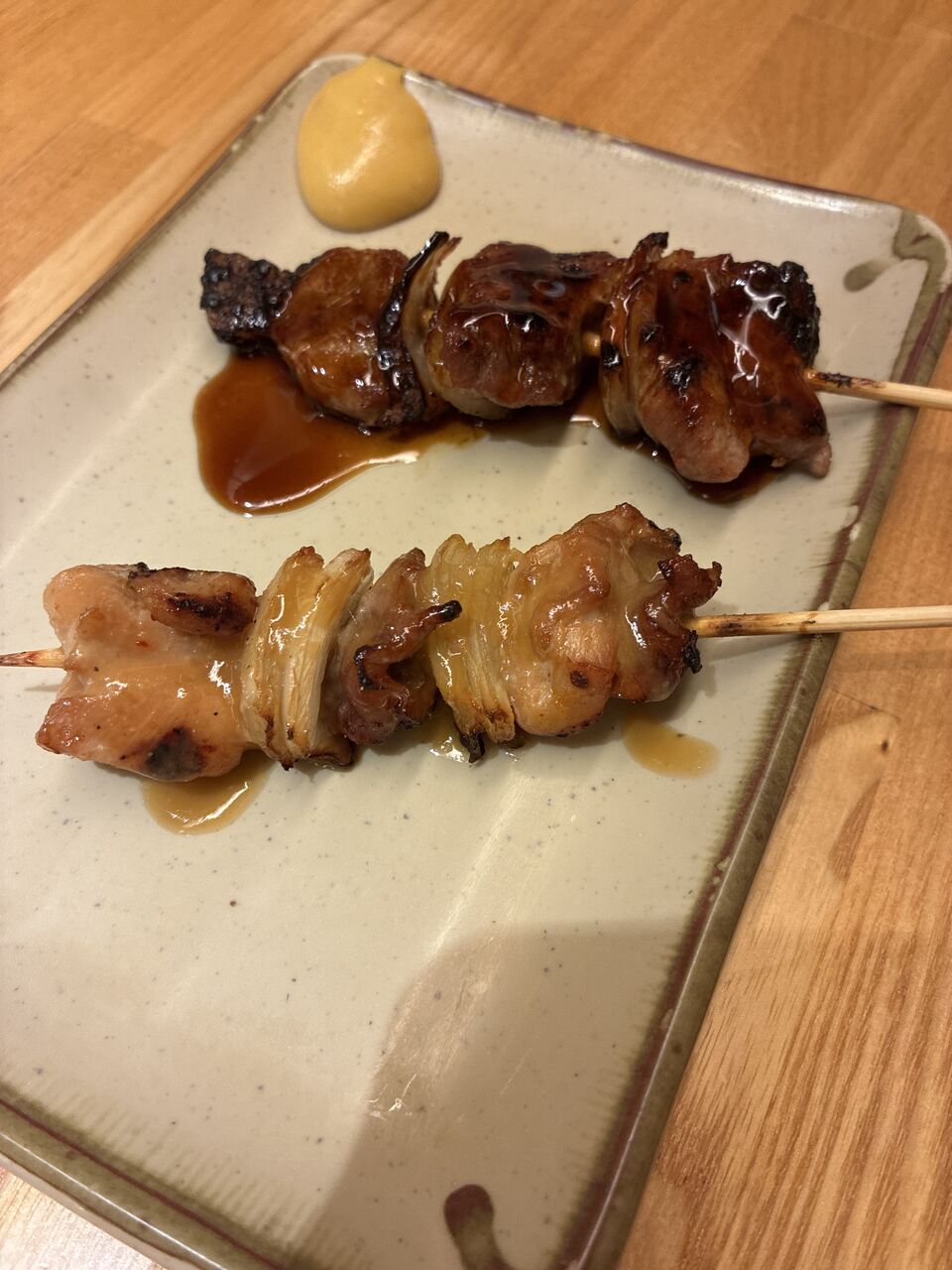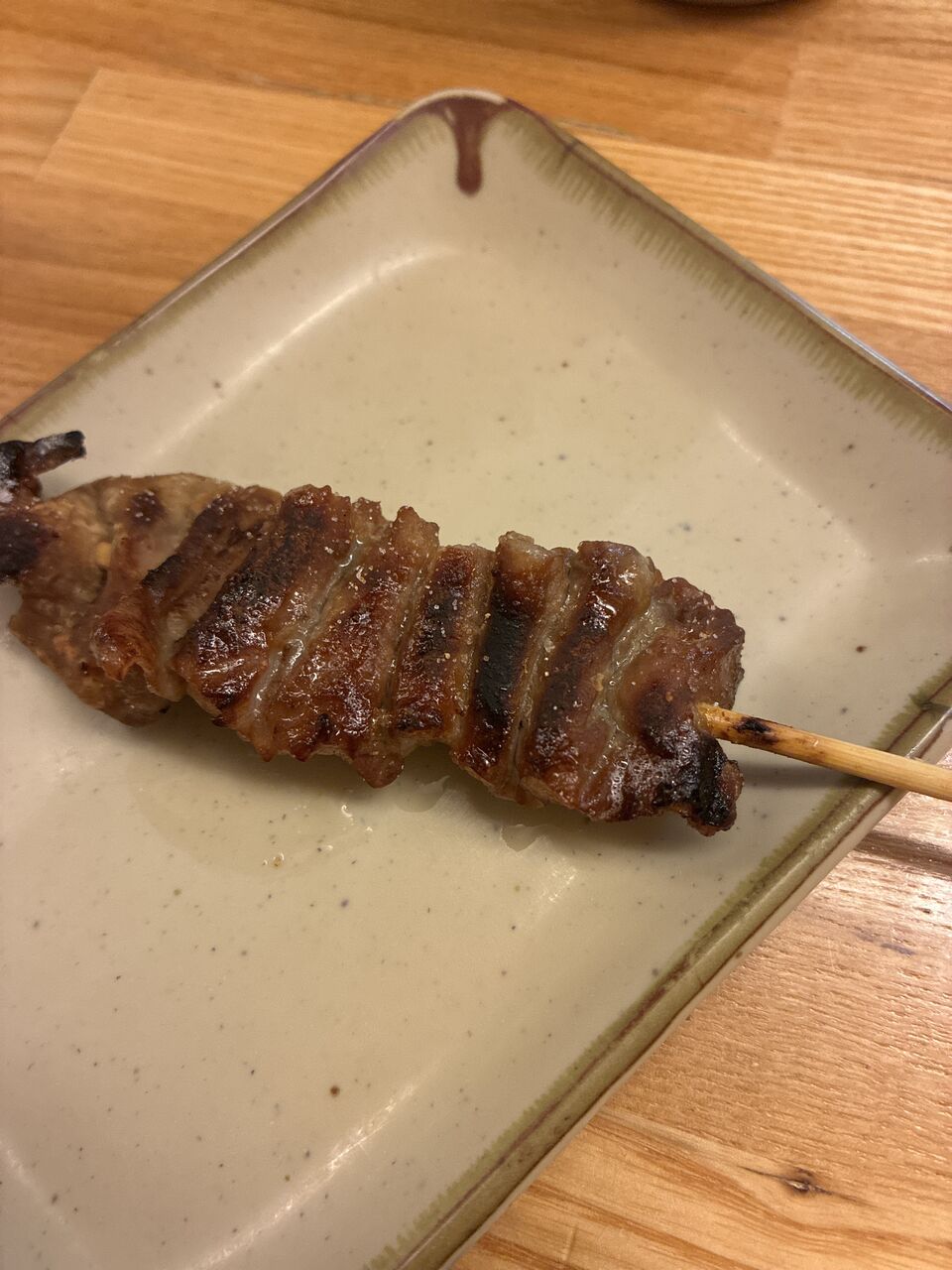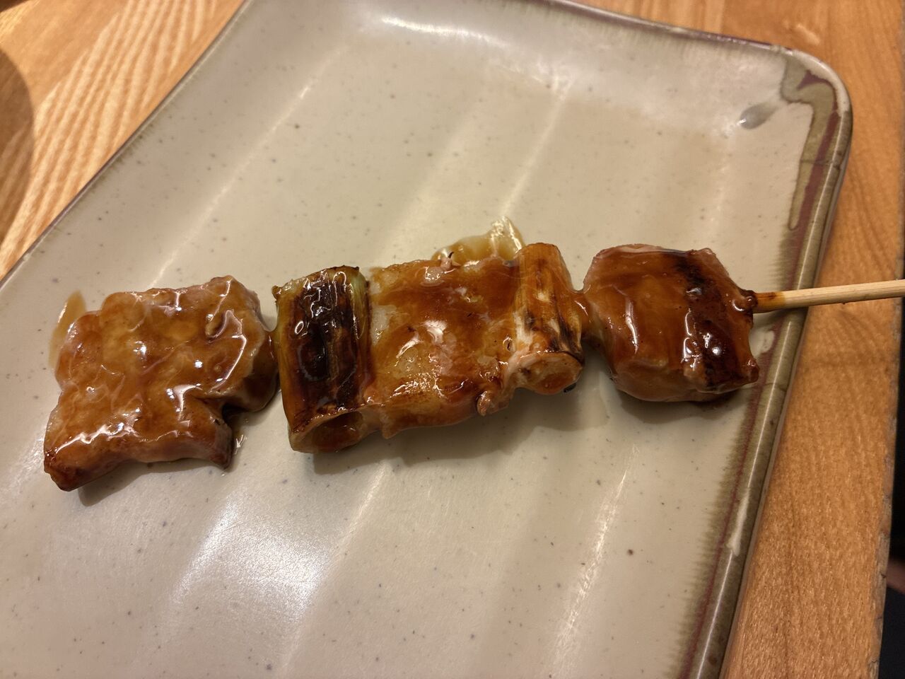 焼き鳥が美味い。こちらは、もちベーコン、牛タン葱塩焼き、豚レバー。