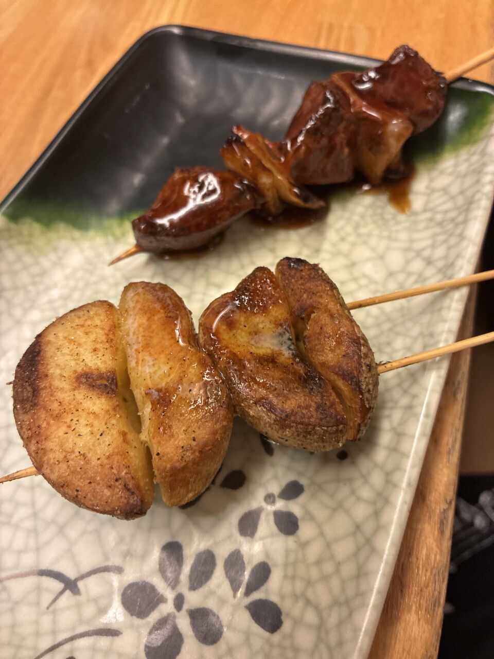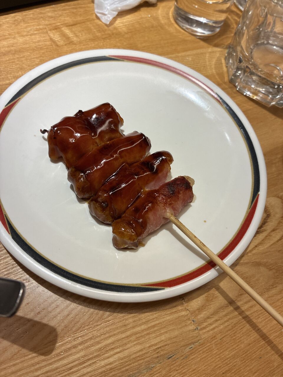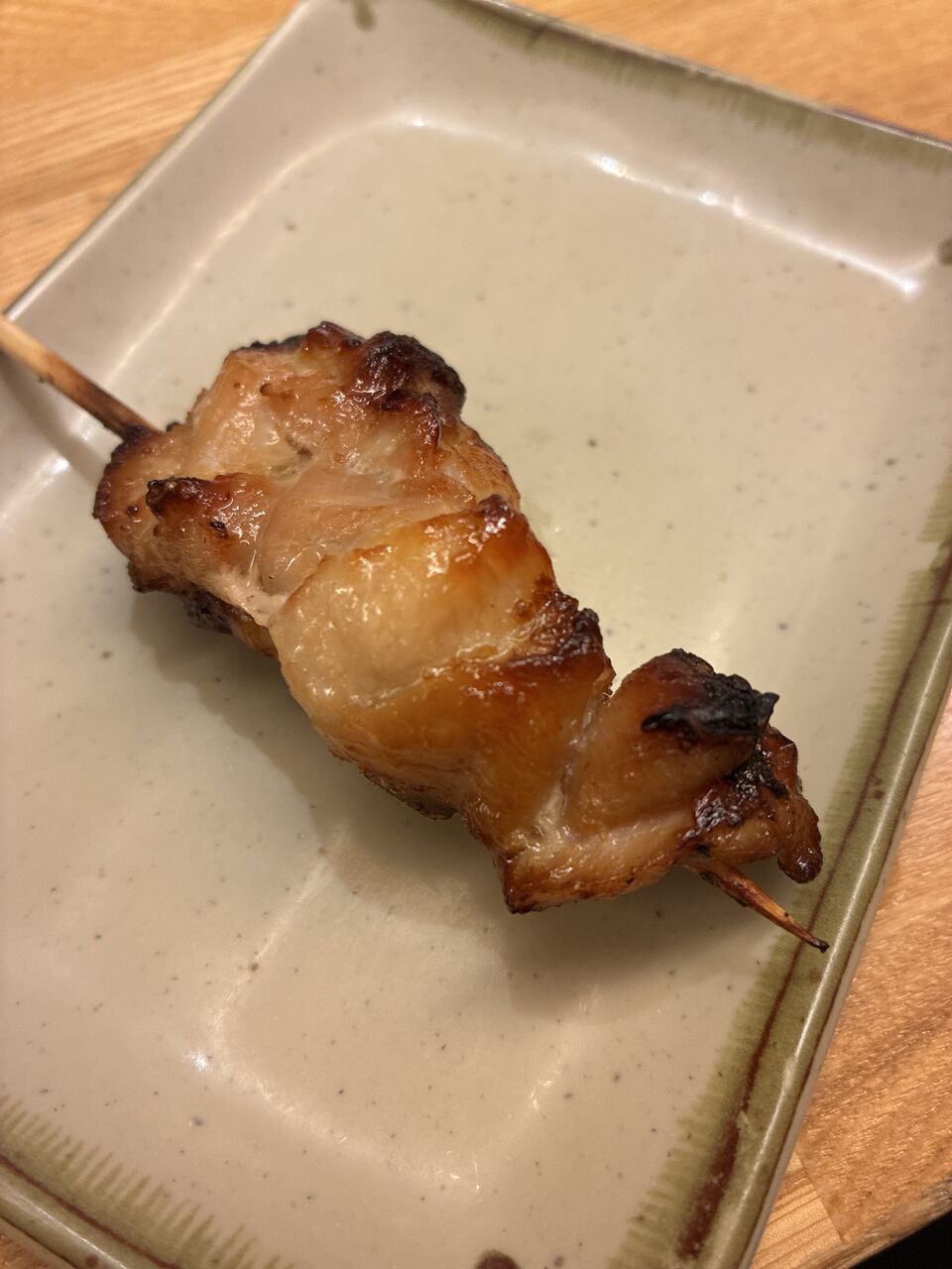 焼き鳥が美味い。こちらは、もちベーコン、牛タン葱塩焼き、豚レバー。