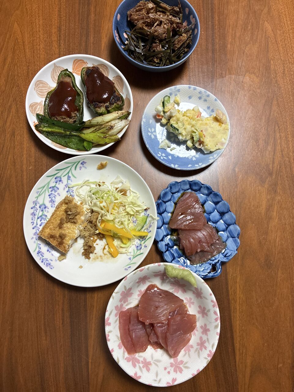 マグロの刺身以外、ピーマン肉詰めハンバーグ、ポテトサラダ、昆布の佃煮、納豆揚げ等は全て自家製です。