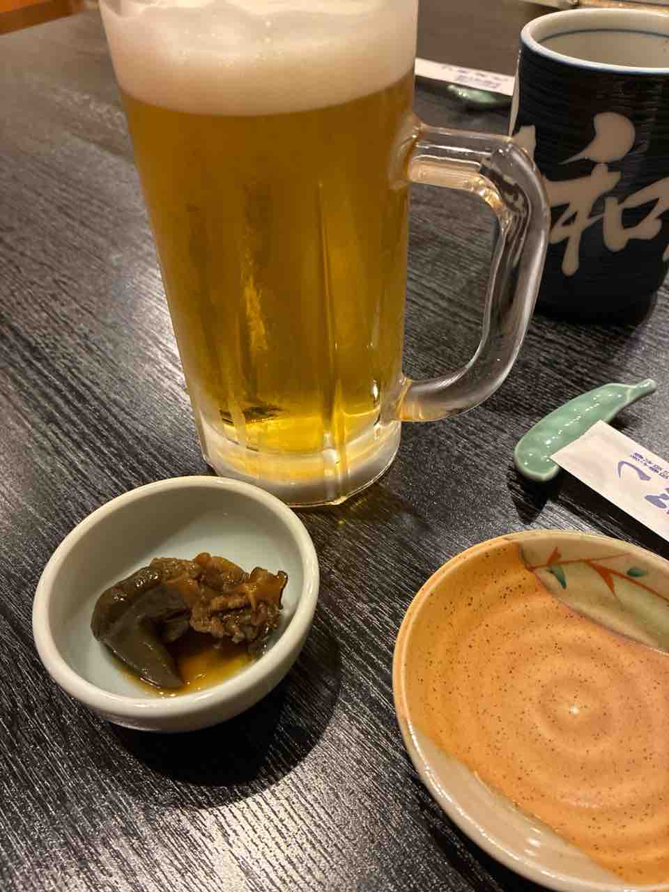 まず生ビールを頼み、お通しはつぶ貝の煮付け。