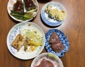おウチごはんも載せろとよく言われるのですが、おウチごはんまでいちいち撮ることが少ないのでして、こちらはある日のおウチごはん。おウチごはんの映りの悪さに定評のある私でして、こちらもご覧の通りですが、味は折り紙つきです。マグロの刺身以外、ピーマン肉詰めハンバ…